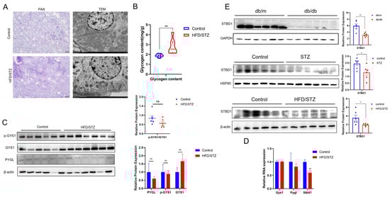 Glycogen deposition and metabolism in the kidney of DKD. (A) Glycogen deposition observed by PAS and TEM (PAS, scale bar = 20 μm; TEM, scale bar = 2 μm). (The HFD/STZ group refers to the DKD + saline group mentioned earlier in the text, so it is the same field as in Figure 2D: DKD kidney, high magnification.) (B) Glycogen content determination. (C,D) Glycogen metabolism in DKD. (E) Detection of STBD1 in the kidney of three distinct diabetic mouse models. *, p < 0.05; **, p < 0.01 vs. control. (E) **, p < 0.01 vs. db/m (n = 5–6).