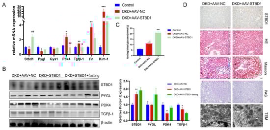 Effect of STBD1 overexpression in DKD. (A,B) Alterations in associated genes and proteins after overexpression of STBD1. (C) Fasting blood glucose in each group of mice after 24 h of fasting. (D) Histopathological and ultrastructural changes after STBD1 overexpression (stains, scale bar = 50 μm; TEM, scale bar = 500 nm). *, p < 0.05; **, p < 0.01; ***, p < 0.001 vs. control. #, p < 0.05; ##, p < 0.01; ###, p < 0.001 vs. DKD+AAV-NC. (B) *, p < 0.05; **, p < 0.01 vs. DKD+AAV-NC (n = 4).