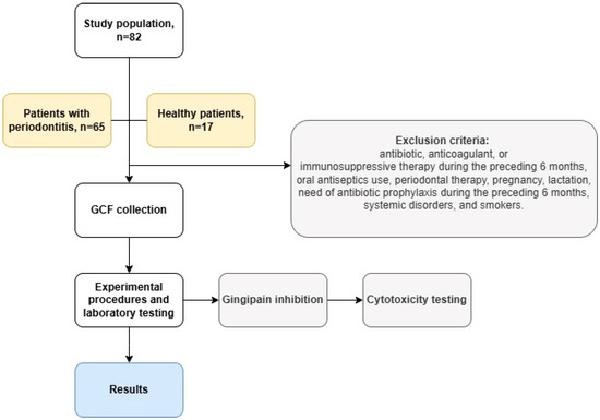 The study included 82 individuals aged 35–60 years, of both genders, divided into two groups. The first group (n = 65) included patients with a clinical diagnosis of periodontitis, at all stages and grades, according to the classification of 2018 [19]. The second group (n = 17) consisted of subjects with clinically healthy periodontium (periodontal pockets ≤ 3 mm and less than 10% bleeding on probing) [19]. Participants met the following inclusion criteria: diagnosis of periodontitis or periodontal health, age > 18 years, and no contraindications for periodontal treatment or research. Criteria for exclusion included the following: patients who underwent antibiotic, anticoagulant, or immunosuppressive therapy during the preceding 6 months, patients who used oral antiseptics or received any periodontal therapy, pregnant or lactating women, patients in need of antibiotic prophylaxis during the preceding six months, systemic disorders, and smokers. The study flowchart is represented in Figure 1.