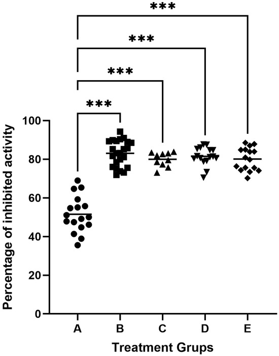 The study used 82 samples of gingival crevicular fluid (GCF). One sample each from a healthy person and a patient with periodontitis were used to inhibit gingipain activity in 100 μL GCF. The samples were incubated with inhibitor solutions of 50 μL, 100 μL, 200 μL, or 500 μL (cysteine or low) derived from egg white or knotweed. We found that the maximum degree of inhibition of gingipain was obtained with the addition of 100 μL inhibitors with an activity of 5.0 units/mL, which accounted for about 85% of proteolytic inhibition in GCF. The GCF activity of subjects classified as healthy was 51.54 ± 9.36% inhibited by egg protein cystatins. In contrast, in patients with periodontitis, it was found that the degree of proteolytic inhibition by egg protein cystatin was 83.08 ± 6.63% of primary activity in GCF (Figure 2). Adjusting for multiple testing by using Dunnett’s method, there were statistically significant differences between the means of the inhibition of cysteine protease activity of each one of the four patient groups and the mean of the inhibition of cysteine protease activity of the healthy group (all adjusted p < 0.001), see Figure 2. The analysis of inhibition rates revealed marked differences between healthy individuals and periodontitis patients, as reflected in the boxplot (Figure 2). In healthy individuals (Group A: healthy controls), the mean inhibition rate was 48.16% ± 8.94%, with values ranging from 31.03% to 68.97%. In contrast, periodontitis patients demonstrated higher and more consistent inhibition rates across treatment groups. For example, in Group B, for periodontitis patients treated with egg white-derived cystatin, the mean inhibition rate was 80.10% ± 5.89%, while in Group C periodontitis patients treated with low-molecular-weight cystatin achieved a mean inhibition rate of 83.08% ± 6.63%, with inhibition rates ranging from 71.89% to 94.33%. Similarly, for Group D, periodontitis patients treated with knotweed-derived cystatin achieved a mean inhibition rate of 81.48% ± 5.89%, reflecting the efficacy of natural inhibitors in advanced periodontitis. Similar results were obtained by inhibiting cysteine gingipains in GCF samples from patients with periodontitis, using low molecular weight inhibitors from egg white, knotweed cystatin, and low-molecular knotweed inhibitors (Figure 2).