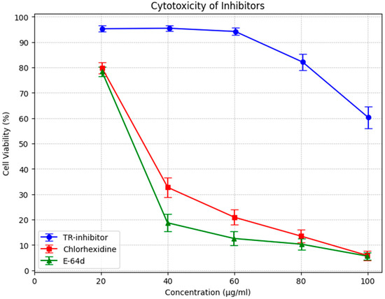 The cytotoxicity assessment of TR-inhibitor, chlorhexidine (CHX), and E-64d revealed notable differences in cell viability across the tested concentrations.