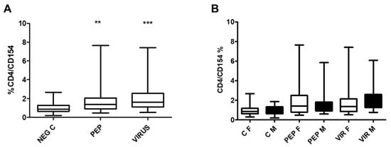 Figure 3. Effects of viral peptides and an inactivated virus on the activation of CD4+ T cells. (A) Overall impact observed in the cohort. The increased expression of CD154 was statistically significant (** p < 0.01 and *** p < 0.001, Bonferroni post hoc test) as determined by repeated measure ANOVA, with a sample size of 52 individuals analyzed in pairs. (B) Data were stratified by gender. Although no significant differences were identified between genders (30 females and 22 males) across the conditions, notable differences were established within each gender group when comparing negative controls to viral peptides, as well as negative controls to an inactivated virus (p < 0.01 in both scenarios). C denotes control, PEP signifies viral peptides, VIR represents inactivated virus, F indicates female, and M denotes male, NEG C refers to negative control.