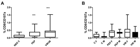 Figure 4. Effects of viral peptides and an inactivated virus on the degranulation of CD8+ T cells, as assessed by CD107a expression. (A) Results of the entire group, demonstrating a significant increase in CD107a expression (*** p < 0.001, Bonferroni post hoc test) as determined by repeated measure ANOVA, with 52 individuals included in the paired analysis. (B) Data are segregated by gender, revealing no significant differences between the genders (comprising 30 females and 22 males) across the various conditions. However, notable differences were identified within each gender when comparing the negative controls with viral peptides to the negative control with an inactivated virus (p < 0.01 for both comparisons). The abbreviations used are as follows: C for control, PEP for viral peptides, VIR for an inactivated virus, F for female, and M for male, NEG C refers to negative control.