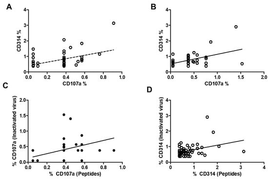 Figure 6 illustrates the correlation between the expression of CD107a and CD314 in stimulated CD8 cells, memory CD8 cells, and bystander CD8 cells using viral peptides (Figure 6A) or an inactivated virus (Figure 6B), as well as the correlation between both markers in CD107a expression (Figure 6C) and CD314 expression (Figure 6D). Correlations were observed in all the graphs and are statistically significant. Figure 6C,D represents both correlations to address the difference in the increase in both markers depending on the stimulus. In Figure 6C, representing CD107a, it is clear that some individuals did not respond to an inactivated virus, with two individuals having very low responses to both stimuli, while others had a higher response. For the CD314 expression (Figure 6D), most values are concentrated in the lower part of the figure, suggesting similar expression post-stimulation; only four individuals differed from this response.