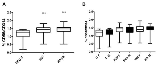 Figure 5. Impact of viral peptides and inactivated virus on the expression of CD314 (NKG2D). (A) Effect on the entire cohort. The increase in expression of CD314 was statistically significant (* p < 0.05, ** p < 0.001, Bonferroni post hoc test), as determined by repeated measure ANOVA with a sample size of n = 52 individuals in paired analysis. (B) Cohort was analyzed by gender. There were no significant differences between genders (30 females and 22 males) across each condition. Nonetheless, significant differences were identified within each gender when comparing negative controls to viral peptides and between negative controls and an inactivated virus (p < 0.01 in both instances). The notation includes C for control, PEP for viral peptides, VIR for inactivated viruses, F for females, and M for males, NEG C refers to negative control.