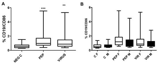 Figure 8. Analysis of the effect of viral peptides and an inactivated virus on the expression of CD86 in B lymphocytes. (A) Outcomes observed across the study population. The increase in CD86 expression was statistically significant (** p < 0.001, *** p < 0.0001, Bonferroni post hoc test), as determined through repeated measure ANOVA, with a sample size of n = 52 individuals in the paired analysis. (B) Data by gender, revealing no significant differences across the various conditions between the female (n = 30) and male (n = 22) groups. Nevertheless, significant differences were identified within each gender when comparing the negative controls to viral peptides and an inactivated virus, yielding a p-value of less than 0.01. Additionally, the notation used in the figure is defined as follows: C represents control, PEP denotes viral peptides, VIR indicates an inactivated virus, F represents female, and M indicates male, NEG C refers to negative control.
