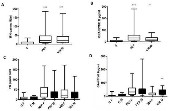 Figure 9. Interferon gamma (IFN-γ) levels (A) and granzyme B (B), following stimulation with peptides and an inactivated virus. Statistically significant differences were observed for both stimuli, with IFN-γ displaying significance at *** p < 0.001, and granzyme B showing significance at *** p < 0.001 and * p < 0.01. When analyzing the data by gender, no significant differences were noted in IFN-γ secretion (C); however, a notable increase in granzyme B was recorded among male participants stimulated with an inactivated virus (D), with significance at ** p < 0.005. To clarify the abbreviations used, C denotes control, PEP represents viral peptides, VIR indicates an inactivated virus, F refers to female, and M signifies male.