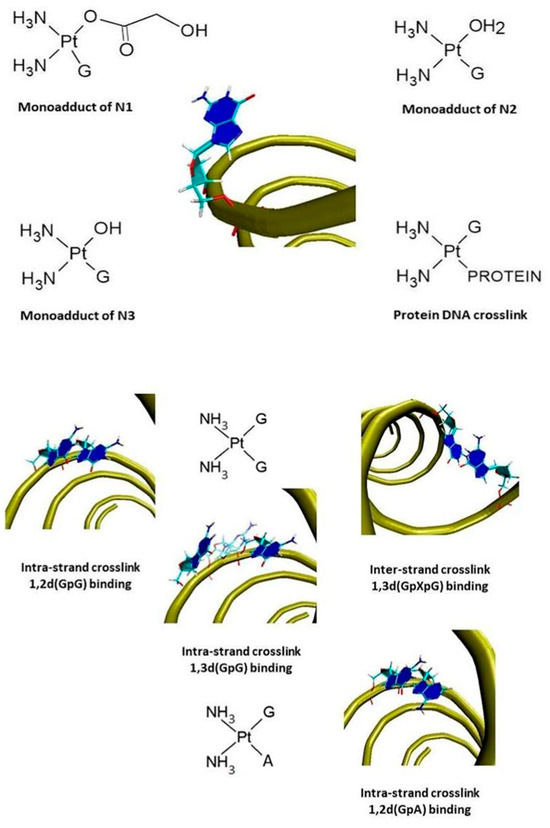 Nedaplatin is administered as a prodrug in an intravenous solution. Once inside the cell, it is hydrolyzed into its active forms. These active forms interact with nucleophiles in the cytoplasm, such as cysteine-containing proteins, including glutathione, generating reactive oxygen species and increasing oxidative stress [27,28,29,30,31,32]. Most importantly, the active forms of Nedaplatin bind to nucleic acids, primarily at the N7 positions of Guanine and Adenine in DNA (Figure 4) [1,7]. As a consequence of this binding to nucleobases, cross-links are formed both between DNA strands and within a single strand. If the changes induced by Nedaplatin are not repaired, they can lead to spontaneous cell death through apoptosis [6,33,34,35,36].