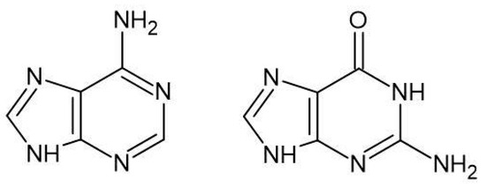 Structures of nucleobases: Adenine (A) and Guanine (G).