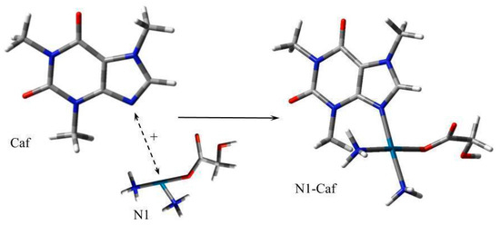 Scheme for formation of an alkaloids (Caf) complex with Nedaplatin (N1). The nitrogen atom (N) is marked in blue, the oxygen atom (O) in red, and the carbon atom (C) in gray, respectively.