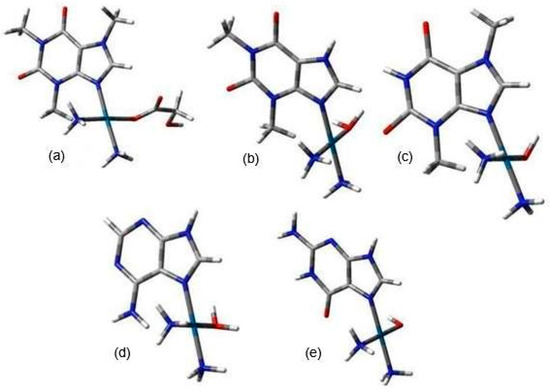 The examples of graphical representation of Nedaplatin (N1, N2, N3) complexes, calculated at the B3LYP/6-31G(d,p) and at MN15/def2-TZVP levels of theory, (a) N1-Caf, (b) N2-Tep, (c) N3-Teb, (d) N2-A, (e) N3-G. All structures are presented in Figure S1 in the Supplementary Materials. The nitrogen atom (N) is marked in blue, the oxygen atom (O) in red, and the carbon atom (C) in gray, respectively.