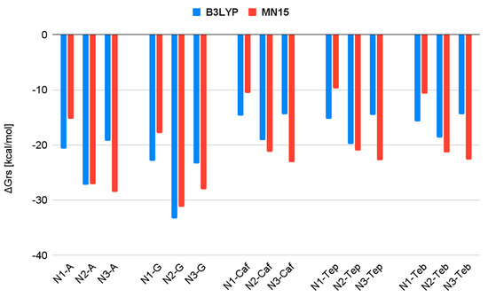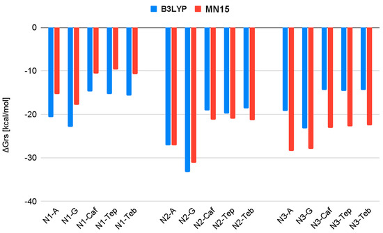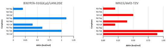 As shown in Figure 8 and Figure 9, all calculated ΔGrs values are negative at both the B3LYP and MN15 levels of calculation, indicating the favorable formation of Nedaplatin hydrolysis products in association with nucleobases and purine alkaloid complexes. These results may support the therapeutic properties of Nedaplatin in its interactions with nucleobases; however, confirmation through clinical trials is necessary.