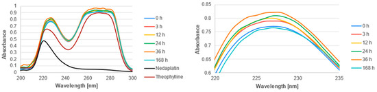 UV-vis absorbance spectrum of a mixture of Theophylline and Nedaplatin during incubation at 37 °C in phosphate buffer at pH 7.4.