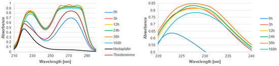As illustrated in Figure 11, Figure 12 and Figure 13, the absorbance values for both the nedaplatin–alkaloid complexes and the individual alkaloids displayed two absorbance maxima at approximately 225 nm and 270 nm. In contrast, Nedaplatin itself exhibited only one maximum at around 220 nm. The overlap of the maxima from the alkaloids and the complexes hindered the ability to track the reduction in alkaloid concentration, thereby making it impossible to calculate the percentage of alkaloids that reacted with Nedaplatin.