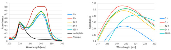 During measurements, the maximum absorption wavelengths for each mixture were identified to monitor potential interactions over time. This approach allowed for the assessment of how B-group vitamins and nucleobases influence the spectral properties of Nedaplatin under physiological conditions.