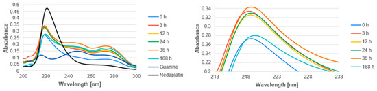 Guanine, being a poorly soluble compound in water, shows relatively low absorbance compared to Adenine or the studied alkaloids. Three significant absorbance maxima were observed at approximately 220 nm, 250 nm, and 270 nm. However, when describing the spectra of the nedaplatin–guanine complexes, only the first wavelength was considered, which corresponds to approximately 220 nm. During the analysis of the UV-Vis spectroscopic spectrum of the nedaplatin–guanine complex, a second absorbance maximum was observed at about 270 nm, similar to what was noted for previously described complexes of the chemotherapeutic agent with Alkaloids and Adenine. For both absorbance maxima of the nedaplatin–guanine complexes, 220 nm and 270 nm, similar to the previously studied nedaplatin complexes with alkaloids and Adenine, an initial increase in absorbance was observed over time, followed by a decrease.