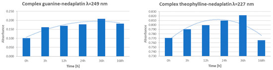 Examples of changes in maximum absorbance over time for Nedaplatin complexes with nucleobase (Guanine) or alkaloid (Theophylline) at a specifically defined wavelength (λ [nm]) are presented. The remaining research results can be found in Figures S2 and S3 in the Supplementary Materials.