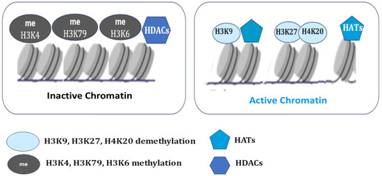 Figure 2. The selective histone modifications in the regulation of the chromatin state. Histone acetyltransferases (HATs) add an acetyl group, and histone deacetylases (HDACs) remove an acetyl group. Histone methylation (H3K9, H3K20, H3K27) and deacetylation (HDACs) result in chromatin condensation and transcriptional repression. Histone demethylation (H3K9, H3K27, H4K20) and acetylation (HATs) maintain the open chromatin state and allow gene transcription.