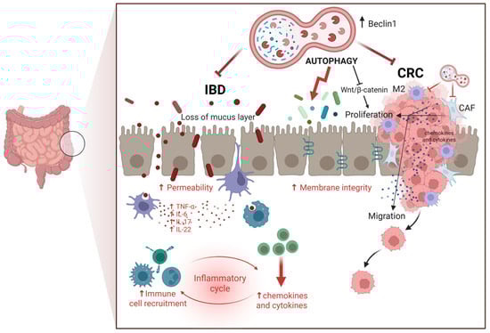 In this context, the picture is further complicated by the fact that autophagy in epithelial intestinal cells influences the microbiota, limiting the growth of pathogenic bacteria that induce inflammation and intestinal permeability [83]. However, autophagy is dysregulated and differentially modulated in CRC cells, depending on the availability of oxygen, nutrients, growth factors, and cytokines, which implies different scenarios in different niches.