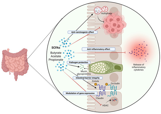 The bacteria in the gastrointestinal tract can ferment non-digestible carbohydrates, generating SCFAs. The main SCFAs are acetate, propionate, and butyrate. SCFAs exhibit various beneficial effects, such as maintaining intestinal barrier integrity, regulating immune function, providing protection against pathogens, and promoting anti-inflammatory responses [76,113]. SCFAs also display anti-tumor properties by inducing apoptosis, reducing the proliferation of neoplastic cells, and mitigating oxidative stress [114]. The homeostatic effects of SCFAs on the colonic epithelium are mediated by SCFA-specific transporters. Specifically, MCT1 is located on both the apical and basolateral membranes, MCT4 is found on the basolateral membrane, and SMCT1 and SMCT2 are located on the apical region of intestinal cells [115].