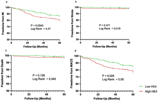Kaplan–Meier curves demonstrating freedom from major adverse cardiovascular events (MACEs) over a period of 5 years (60 months). Patient were split into low (shown in green) vs. high (shown in red) human epididymis protein 4 (HE4) based on median plasma level for (a) myocardial infarction (MI), (b) stroke, (c) cardiovascular-related death, and (d) MACEs. Vertical lines represent censored patients.