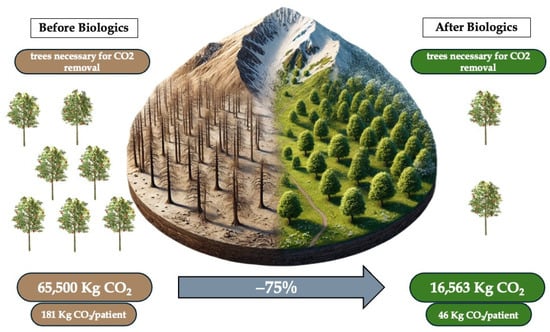 To contextualize the findings of this study within botanical principles for enhanced interpretability, we draw upon established data regarding CO2 absorption by temperate forest trees. A typical temperate forest tree, such as those found in Italy (where the study data were collected), absorbs approximately 25 kg of CO2 per year. Our analysis reveals a mean gain, in terms of equivalent trees, of 599 per year following the introduction of biologic treatments, which translates to an average of 1.7 trees per patient (Figure 1). Given that the biologic drugs considered in this study are known to facilitate long-term disease control, the observed CO2 savings are projected to remain consistent over time.