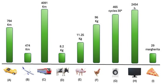 Visualization of yearly gain of CO2, in daily routinary samples. Legend. Yearly mean CO2 gain, with severe asthma control, converted into common daily life samples. (A) Car Km mean between normal fuel, diesel and hybrid/electric car; (B) plane; (C) train; (D) cow meat production; (E) pig meat production; (F) chicken meat production; (G) washing machine cycles at 30°; (H) hours of on-demand platforms (i.e., Netflix, Disney+, ecc…); (I) number of margherita pizzas.