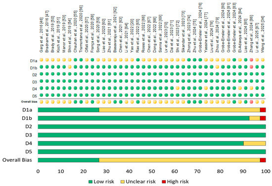 Risk of bias summary of all included RCTs (n = 40). D1a: Randomization process; D1b: timing of identification or recruitment of participants; D2: deviations from intended intervention; D3: missing outcome data; D4: measurement of the outcome; D5: selection of the reported result.