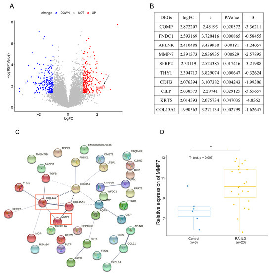 MMP-7 expression was significantly upregulated in RA-ILD lung tissues, and MMP-7 may interact with collagen-I. (A) Volcano plot shows differentially expressed genes (DEGs) in RA-ILD lung tissue compared to normal lung tissue. Red: DEGs that were significantly upregulated. Blue: DEGs that were significantly downregulated. p < 0.05, |log FC| ≥ 1. The black arrow indicates the MMP-7 gene. (B) The top 10 differentially expressed genes (DEGs) that were upregulated in RA-ILD lung tissues, namely COMP, FNDC1, APLNR, MMP-7, SFRP2, THY1, CDH3, CILP, KRT5 and COL15A1. (C) The interaction between MMP-7 and collagen-I within lung tissues of RA-ILD patients. PPI network map constructed based on log FC values > 1.5 of 38 DEGs in RA-ILD lung tissue samples. Solid lines represent strong interactions between proteins; dashed lines represent weak interactions between proteins. The red boxes respectively represent collagen-I and MMP-7. (D) MMP-7 showed high expression levels in the RA-ILD patients’ lung tissues. Control: normal lung tissue; RA-ILD: RA-ILD lung tissue; * p < 0.05.