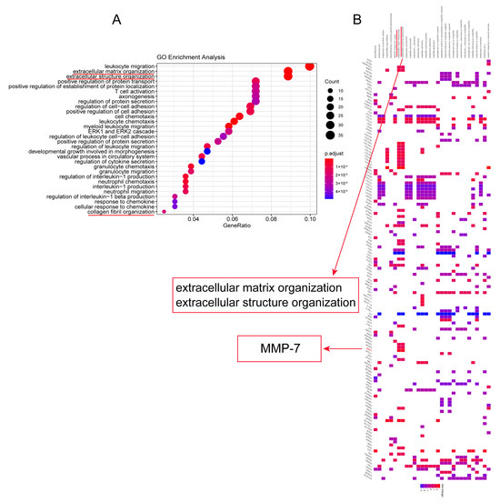 In RA-ILD lung tissues, MMP-7 was involved in the formation of the extracellular matrix. GO analysis was used to analyze the biological processes enriched by these DEGs. (A) GO analysis of RA-ILD lung tissue mRNA revealed their involvement in extracellular matrix and extracellular structure composition, ranking among the top three (marked with red underline). (B) MMP-7 was involved in the formation of the extracellular matrix and structure. Blue part indicates genes which were expressed at a lower level in RA-ILD compared to normal lung tissue samples, while the red part indicates the genes which were expressed at a higher level in RA-ILD compared to normal lung tissue samples.