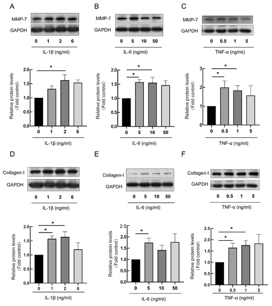 The RA-ILD-related inflammatory factors induced MMP-7 and collagen-I expression within PMCs. Identified inflammatory cytokines, including IL-1β, IL-6 and TNF-α, were used to treat cells. (A,D) PMCs were treated with IL-1β using different contents: 0, 1, 2 and 6 ng/mL for 48 h (n = 8). (B,E) PMCs were treated with IL-6 using different contents: 0, 5, 10 and 50 ng/mL for 72 h (n = 5). (C,F) PMCs were treated with TNF-α using different contents 0, 0.5, 1 and 5 ng/mL for 48 h (n = 3). MMP-7 (A–C) and collagen-I (D–F) protein contents were measured by Western blot. Data are expressed as mean ± SEM. * p < 0.05 vs. 0 ng/mL.