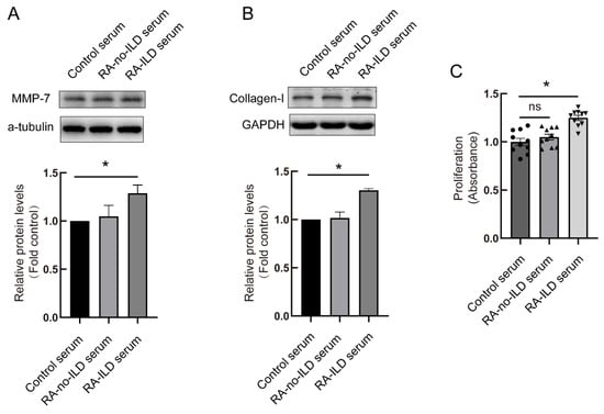 RA-ILD patients’ serum promoted production of MMP-7 and collagen by PMCs and cell proliferation. Control serum: the healthy volunteers’ serum treatment group. RA-no-ILD serum: RA patients’ serum treatment group. RA-ILD serum: RA-ILD patients’ serum treatment group. PMCs were incubated with 5% control serum, RA serum and RA-ILD serum for 48 h, MMP (A) and collagen-I (B) protein contents were measured by Western blot (n = 4). (C) PMCs were treated with 5% patients’ serum for 24 h, and then cell proliferation was detected by CCK-8 assay (n = 8). Data are expressed as mean ± SEM. * p < 0.05 vs. control serum.
