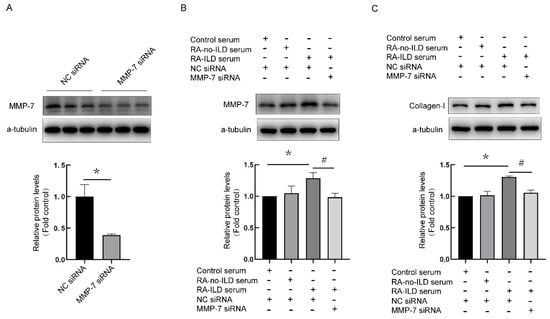 MMP-7 siRNA prevented MMP-7 and collagen-1 overexpression induced by RA-ILD patients’ serum in PMCs. (A) NC siRNA and MMP-7 siRNA were transfected into PMCs for 72 h (n = 6). MMP-7 protein expression was detected through Western blotting, which reflected the interference efficiency. (B,C) Following transfection with MMP-7 or NC siRNA, PMCs were exposed to control serum, RA-no-ILD serum and RA-ILD serum for 48 h, after which protein levels of MMP-7 (B) as well as collagen-I (C) were measured through Western blot. Results are shown as mean ± SEM (n = 4). * p < 0.05 vs. control serum; # p < 0.05 vs. RA-ILD serum.