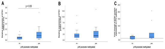 | Clinicopathological Parameter | p16 Methylated and ETS1 Protein Levels High (n) | p-Value | ||