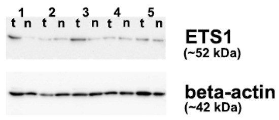 - Novković, S.S.; Šelemetjev, S.; Miljuš, J.J.; Živaljević, V.; Dunđerović, D.; Milinković, M.; Denčić, T.I. ETS1 Protein Expression May Be Altered by the Complementarity of ETS1 mRNA Sequences with miR-203a-3p and miR-204-3p in Papillary Thyroid Carcinoma. Int. J. Mol. Sci. 2025, 26, 1253. [Google Scholar] [CrossRef]