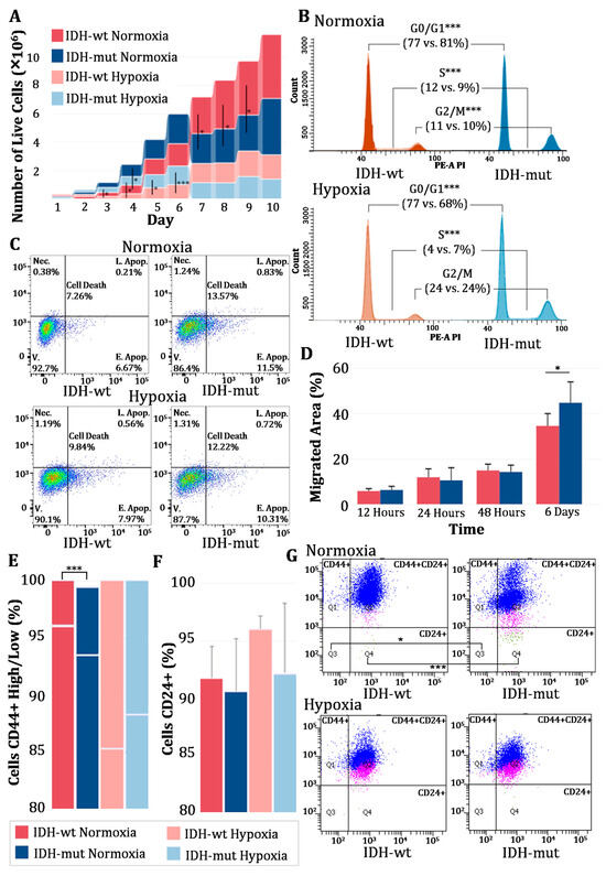 Differences between IDH-wt and IDH-mut cells under normoxic and hypoxic conditions. (A) Ribbon bar chart of the growth curve of IDH-wt and IDH-mut cells. (B) Cell cycle histogram of the distribution in IDH-wt and IDH-mut cells (x-axis: PE-A signal intensity; y-axis: number of events). (C) Gated dot plots of cell death in IDH-wt and IDH-mut cells. Quadrants indicate necrosis (Nec.), late apoptosis (L. Apop.), early apoptosis (E. Apop.), and viable cells (V.). Total cell death corresponds to the sum of necrosis and early and late apoptosis. Color intensity reflects event density in each region of the plot. (D) Bar chart of cell migration in IDH-wt and IDH-mut cells under normoxia. (E) Stacked bar chart of CD44+ marker expression in IDH-wt and IDH-mut cells. Lower bars represent CD44+ High and upper bars represent CD44+ Low populations. (F) Bar chart of CD24+ marker expression in IDH-wt and IDH-mut cells. (G) Gated dot plots of CD24 and CD44 co-expression profiles in IDH-wt and IDH-mut cells. Quadrants: Q1 = CD24−/CD44+, Q2 = CD24+/CD44+, Q3 = CD24−/CD44−, and Q4 = CD24+/CD44−. Asterisks indicate statistically significant differences between IDH-wt and IDH-mut under normoxic and hypoxic conditions (* p < 0.05, *** p < 0.001). IDH-wt: IDH wildtype; IDH-mut: IDH mutant.