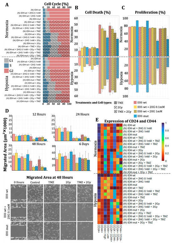 Differences between IDH-wt, IDH-wt + 2HG (0.1 mM), IDH-wt + 2HG (1 mM), and IDH-mut cells in response to TMZ (temozolomide), 2 Gy radiation, and the combination (TMZ + 2 Gy) under normoxic and hypoxic conditions. (A) Stacked bar chart of cell cycle distribution (G1, S, and G2 phases). Cell groups are indicated by color, and treatment conditions by patterns. (B) Bar chart of total cell death (sum of early apoptosis, late apoptosis, and necrosis). Cell groups are represented by color, and treatments by patterns. (C) Bar chart of cell proliferation across treatment conditions. Cell groups are represented by color, and treatments by patterns. (D) Bar chart of cell migration at 12, 24, 48 h, and 6 days. Below, representative images of wound healing at 48 h are shown. (E) Heatmap of CD44+ and CD24+ marker expression (z-score scale). Blue indicates higher expression values, and red indicates lower values. N: Normoxia, H: Hypoxia, IDH-wt: IDH wildtype; IDH-mut: IDH mutant; 2HG: 2-hydroxyglutarate; 2Gy: 2 Gray dose of ionizing X-ray radiation.