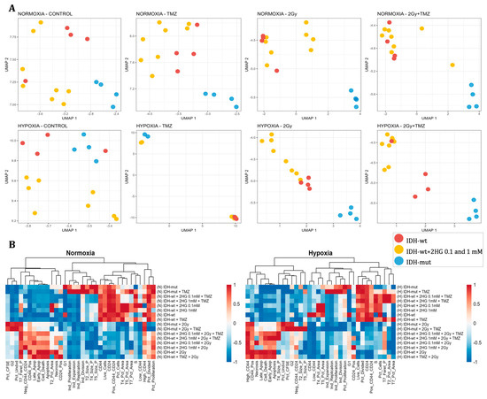 To evaluate whether the experimental variables could differentiate sample groups, a UMAP dimensionality reduction was performed using all measured parameters. As shown in Figure 3A, samples were segregated according to IDH status, oxygen conditions, and treatment. Clustering was particularly evident in groups treated with 2 Gy or 2 Gy + TMZ, especially under hypoxia, where the effect of 2HG treatment on IDH-wt cells was observed by the clear separation of this group from IDH-wt cells without 2HG, despite undergoing radiotherapy or combined therapy. In contrast, control and TMZ-only groups showed more dispersed distributions. Hierarchical clustering and heatmaps (Figure 3B) further supported these groupings, revealing consistent patterns within treatments and highlighting differences between normoxic and hypoxic conditions.