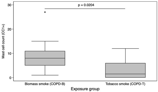 Comparison of mast cell counts by exposure type (biomass vs. tobacco). Boxplot comparing mast cell counts (CC1+ positive cells per high-power field) between COPD patients exposed to biomass smoke (COPD-B, left) and those exposed to tobacco smoke (COPD-T, right). Data represents medians and interquartile ranges. A significantly higher mast cell count was found in the COPD-B group (Mann–Whitney U test, p = 0.0204).