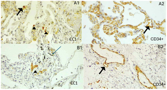 Representation of mast cell count (CC1+) and CD34+ intensity in vascular endothelium in COPD-B and COPD-T. (A1,A2) Biopsy from a patient with COPD-B. (A1) Mast cell clusters (arrowhead) are distributed in the submucosal regions and vascular intima (marked by arrows). (A2) The CD34+ marker shows significant intensity in the vascular endothelium (arrows). (B1,B2) Biopsy from a patient with COPD-T. (B1) The mast cell marker shows a cluster of mast cells in the submucosa (arrowhead) and alveolar anthracosis (thin arrow, blue). (B2) The endothelial marker CD34+ shows less intensity. Images were obtained at 40× magnification. Quantification was based on ten high-power fields per sample, in regions selected for preserved alveolar structure.