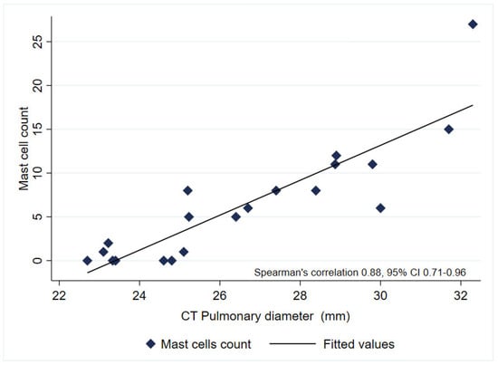 Correlation between pulmonary artery diameter and mast cell count in COPD patients. Scatterplot showing the association between pulmonary artery diameter measured by chest CT (x-axis) and the number of mast cells identified by immunohistochemistry (CC1+ staining) in lung tissue (y-axis). Each point represents one patient sample. The fitted line represents linear regression. A strong positive correlation was observed (Spearman’s rho = 0.879, 95% CI 0.71–0.96, p < 0.001).