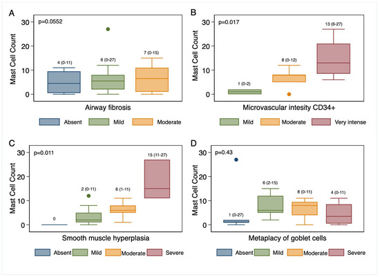 Mast cell total count and distribution of four histologic features. Non-parametric tests, such as the Kruskal–Wallis test, were used to compare medians among independent groups. (A): airway fibrosis categories. (B): Microvascular intensity. (C): Smooth muscle hyperplasia. (D): Metaplasia of goblet cells.
