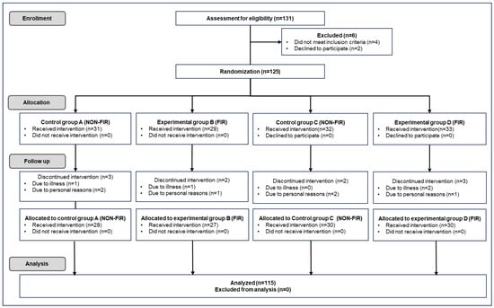 The exclusion or discontinuation criteria for the intervention were as follows: pregnant women or applicants with cancer, diabetes, cardiovascular disease, or neurological diseases. Participants with mental weakness or anxiety symptoms, mental illness (including dementia), or those who withdrew owing to illness or personal reasons were excluded from the intervention. Of the 131 recruited participants, 125 participated in the experiment, excluding 4 who did not meet the selection criteria and 2 who dropped out for personal reasons. Participants received a detailed explanation of the experiment and provided written informed consent to participate. Participants (n = 60) were first randomly divided into Group A (n = 31), who were exposed to heat for 30 min on an electric mat set to 40 °C, and Group B (n = 29), who were exposed to FIR on a loess bio-ball mat at 40 °C for 30 min. Another group of participants (n = 65) was randomly divided into Group C (n = 32), who were exposed to heat for 7 h while sleeping on an electric mat set at 30 °C, and Group D (n = 33), who were exposed to FIR for 7 h while sleeping on a loess bio-ball mat set at 30 °C. During the follow-up process for the experiment, three subjects from Group A, two from Group B, two from Group C, and three from Group D were excluded from the experiment owing to illness and personal reasons. After excluding 10 subjects from the experiment, the remaining subjects (n = 115) participated in each experiment as groups A (n = 28), B (n = 27), C (n = 30), and D (n = 30).