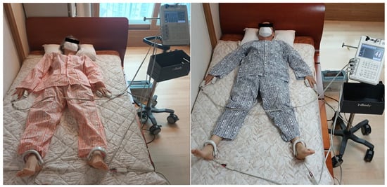 Impedance measurements to detect changes in inflammatory fluid-related values in the subjects’ trunks were performed using a body water analyzer (InBody S10, InBody, Seoul, Republic of Korea). During the measurement, the participants laid comfortably or slept on an electric mat (SW-301, SHM, Samhwa Electric Blanket, Busan, Republic of Korea), a loess bio-ball mat manufactured by Hanwool Bio, and a Jangsoo bio-ball bed (7111, Jangsoo Industry Co., Ltd., Seoul, Republic of Korea), with electrodes attached to both ankles, thumbs, and middle fingers, as shown in Figure 2.