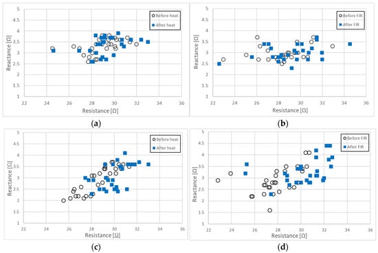 Relationship between R and Xc measured at 50 kHz: (a) before and after 30 min of conductive heating on an electric mat set at 40 °C, (b) before and after30 min of exposure to FIR from a loess bio-ball mat set at 40 °C, (c) before and after 7 h of conductive heating during sleep on an electric mat set at 30 °C, and (d) before and after 7 h of FIR exposure during sleep on a loess bio-ball mat set at 30 °C.