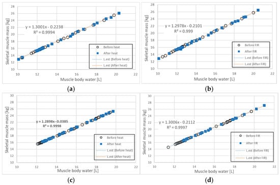 Relationship between MBW and SMM before and after (a) 30 min of heat exposure using an electric mat at 40 °C, (b) 30 min of FIR exposure using a loess bio-ball mat set at 40 °C, (c) 7 h of heat exposure using an electric mat set at 30 °C during sleep, and (d) 7 h of FIR exposure using a loess bio-ball mat set at 30 °C during sleep. The blue dotted line represents the estimated linear regression line (L.est) before heat or FIR exposure, while the red dotted line indicates L.est after exposure. All conditions demonstrate strong linear correlations ( ≥ 0.999), with the most significant changes observed in (d) following long-term FIR exposure during sleep.