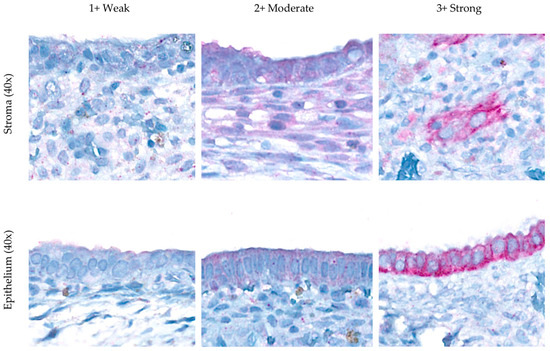 VDR expression, scored using the histo-score (H-score) from IHC-stained slides, was interpreted by two independent pathologists. The pathologists graded the staining intensity into four categories: negative (0), weak (1+), moderate (2+), and strong (3+), and described the percentage of the area stained (Figure 1). The H-score had an analytical range of 0–300 and was calculated using the following formula: H-score = [(0 × P0) + (1 × P1) + (2 × P2) + (3 × P3)]. This formula uses the percentage (P) of cells (ranging from 0% to 100%), where P0 represents the proportion of negative cells, P1 represents the proportion of weakly stained cells, P2 represents the proportion of moderately stained cells, and P3 represents the proportion of strongly stained cells [30]. The intraclass correlation coefficient (ICC) score between the two pathologists for both stroma and epithelium was 0.56, indicating poor reliability in stroma but excellent reliability in epithelial component expression. The average H-score of the stromal and epithelial cells was used for the analysis.