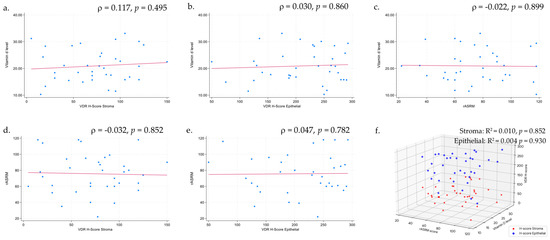 Spearman’s rho correlation analyses did not demonstrate any significant linear relationships between vitamin D level, VDR expression (stromal or epithelial H-scores), and rASRM score (all p > 0.05). Similarly, the corresponding scatter plots (Figure 2a–e) show no discernible patterns in the data. Consistent with these results, multivariable linear regression confirmed the absence of significant associations among these continuous variables (all p > 0.05) (Figure 2f).