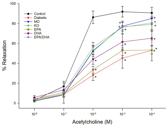 Effect of dietary intervention with menhaden oil, and ethyl esters of EPA, DHA or the combination of EPA + DHA on vascular relaxation by acetylcholine in epineurial arterioles of the sciatic nerve in diabetic Sprague-Dawley rats. Pressurized arterioles (40 mm Hg and ranging from 60–100 µm luminal diameters) were constricted with phenylephrine (30–50%) and incremental doses of acetylcholine were added to the bathing solution while recording steady state vessel diameter. The number of rats in each group ranged from 8–9. Data are presented as the mean of % relaxation ± S.E.M. * p < 0.05 compared to control rats. + p < 0.05 compared to diabetic rats.