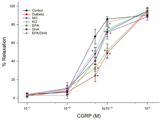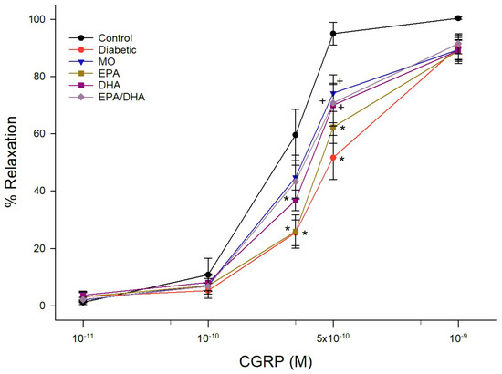 Effect of dietary intervention with menhaden oil, krill oil, and oils from algae that produce EPA, DHA or the combination of EPA + DHA on vascular relaxation by CGRP in epineurial arterioles of the sciatic nerve in diabetic Sprague-Dawley rats. Pressurized arterioles (40 mm Hg and ranging from 60–100 µm luminal diameters) were constricted with phenylephrine (30–50%) and incremental doses of CGRP were added to the bathing solution while recording steady state vessel diameter. The number of rats in each group ranged from 8–9. Data are presented as the mean of % relaxation ± S.E.M. * p < 0.05 compared to control rats. + p < 0.05 compared to diabetic rats.